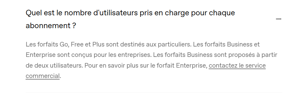 Option « propre » si vous êtes plusieurs ChatGPT Business dès 2 utilisateurs Accès séparés, cadre adapté au travail Élevée